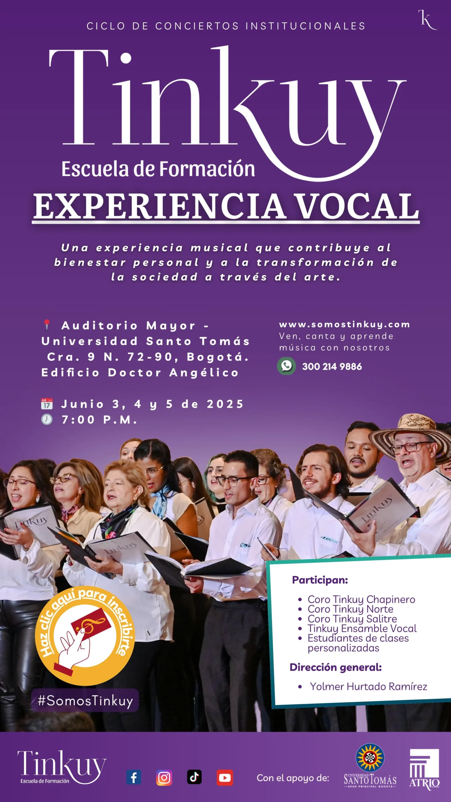 La magia de la música vocal se vivirá a través de la “Experiencia Vocal Tinkuy”, más que un concierto, un encuentro maravilloso entre artistas y público que teje emociones, aprendizaje e interacción en unión y alegría. Este concierto de Tinkuy Ensamble Vocal y su Escuela de Formación Musical, promete envolver al público en una verdadera experiencia musical de disfrute, que bajo la dirección del Maestro Yolmer Hurtado Ramírez, magister en dirección sinfónica, director coral, y profesor universitario con mas de 20 años de experiencia, reúne a cerca de 100 artistas en escena, que unen las voces de sus coristas y los instrumentos de sus músicos profesionales acompañantes, para llenar el Auditorio Mayor de la Universidad Santo Tomás de sensaciones, emoción y armonía, los días 3, 4 y 5 de junio a las 7:00 p.m. Este espectáculo combina melodías de repertorio colombiano, latinoamericano e internacional, la mayoría de ellas canciones cercanas, que todos conocemos, con bellos arreglos vocales que nos permitirán crear una experiencia única que más allá de estar pasivo como público, te permitrá aprender, interactuar con los artistas, comparar, sentir y hasta cantar juntos.